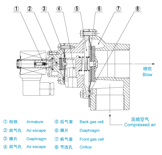 電磁脈沖閥分成前、后二個氣室,當接通壓縮空氣時,壓縮空氣通過節(jié)流孔進入后氣室,此時后氣室壓力將膜片組件緊貼閥的輸出口,